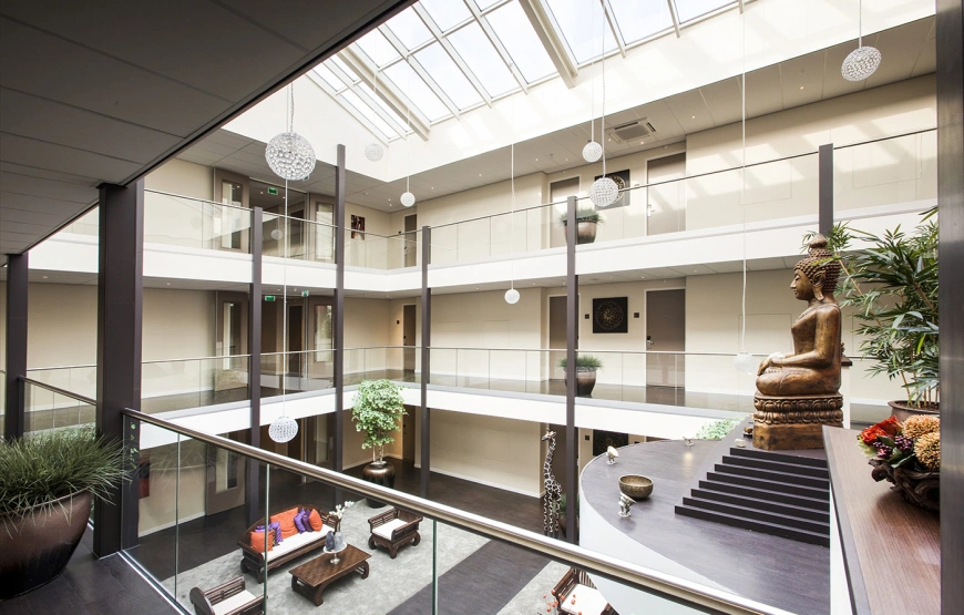 An underground tunnel connects the hotel to sauna, wellness and beauty resort Thermen Bussloo. Atmosphere and experience were central to the design. The glass balustrades in the interior play an important role in this.